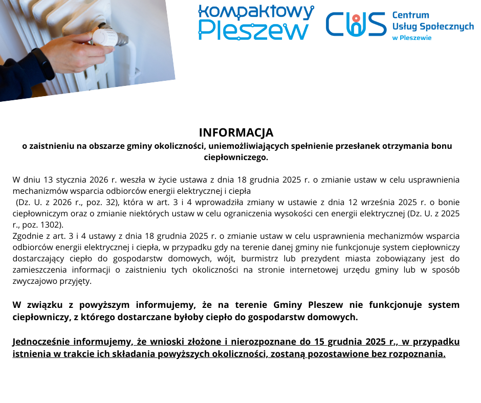 Informacja o zaistnieniu na obszarze gminy okoliczności, uniemożliwiających spełnienie przesłanek otrzymania bonu ciepłowniczego 21 stycznia 2026
