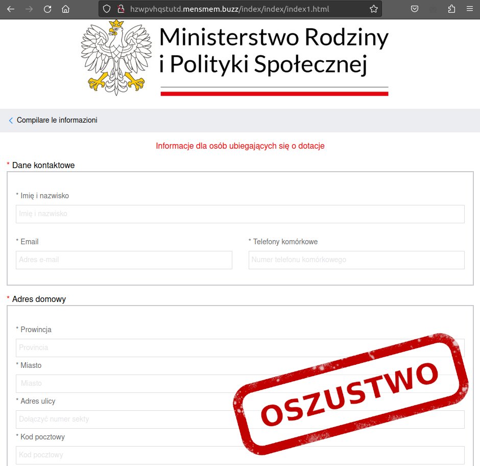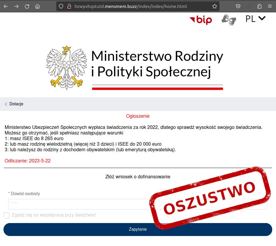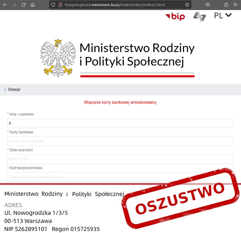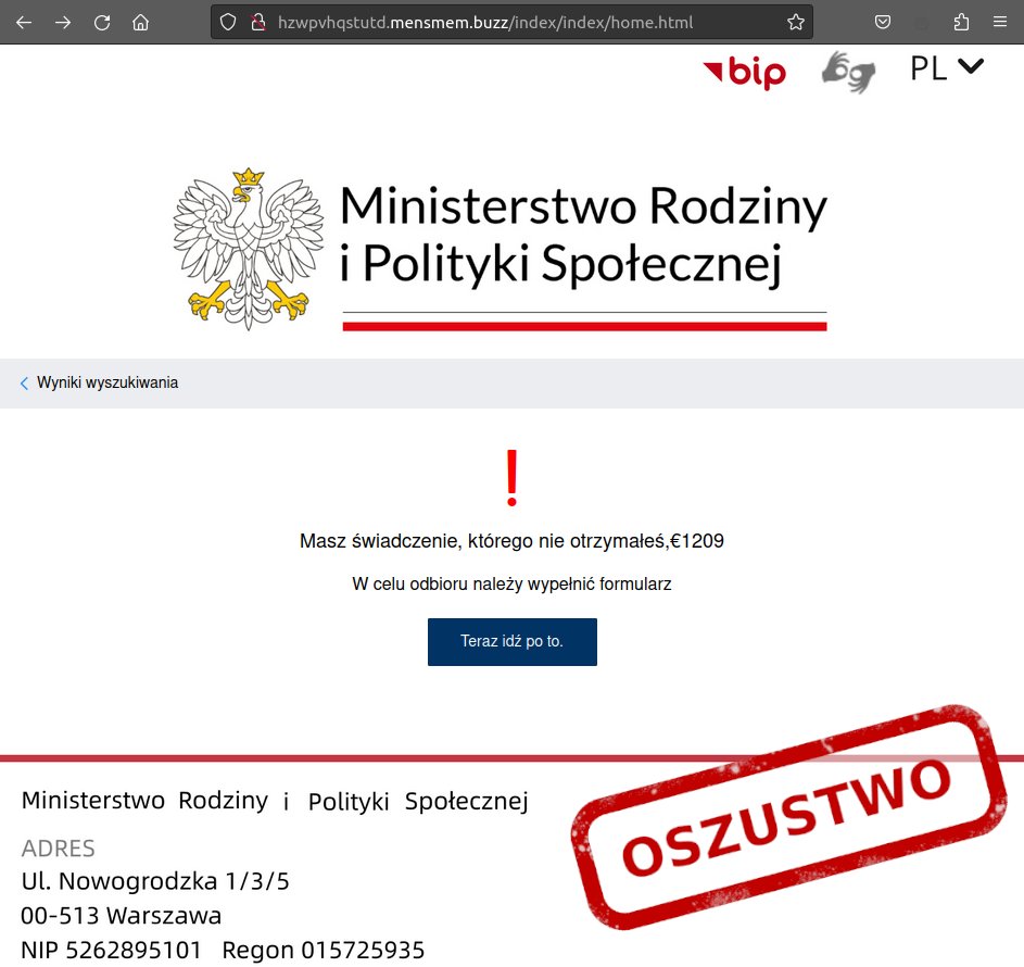 CERT Polska ostrzega przed oszustami podszywającymi się pod Ministerstwo Rodziny i Polityki Społecznej (MRiPS).